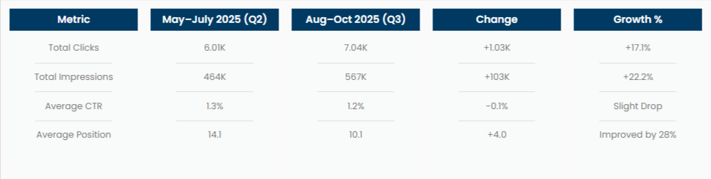 - A/B tested meta descriptions for high-impression pages to improve CTR.
